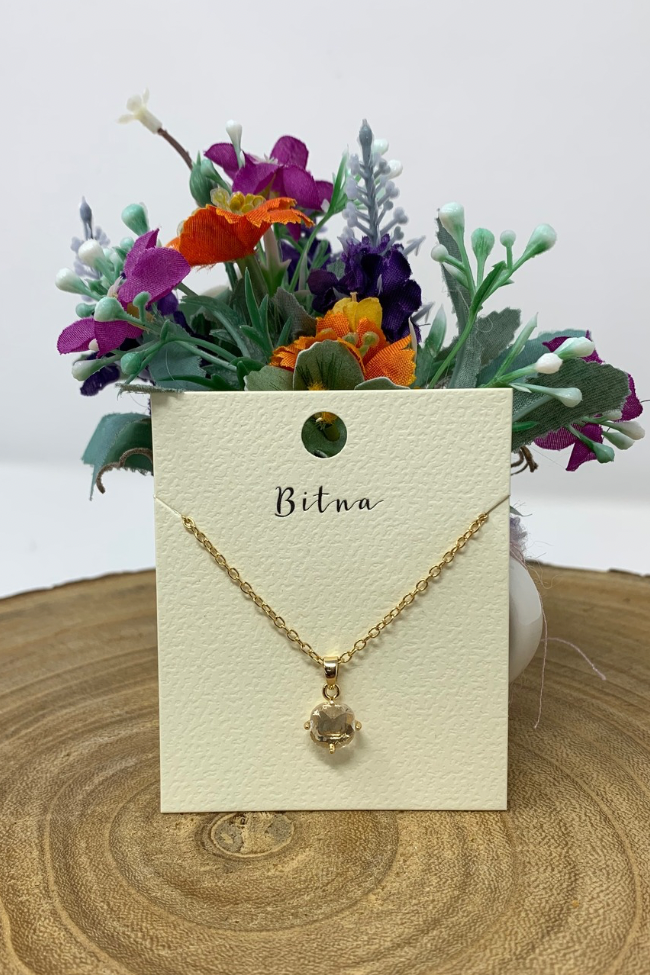 This dainty gold-tone solitaire crystal pendant necklace features a finely cut crystal pendant, adding a touch of sparkle to any outfit. The pendant is set in a classic four-prong gold-tone setting and hands gracefully from a delicate gold chain. This necklace is perfect for both everyday wear and special occasions.
